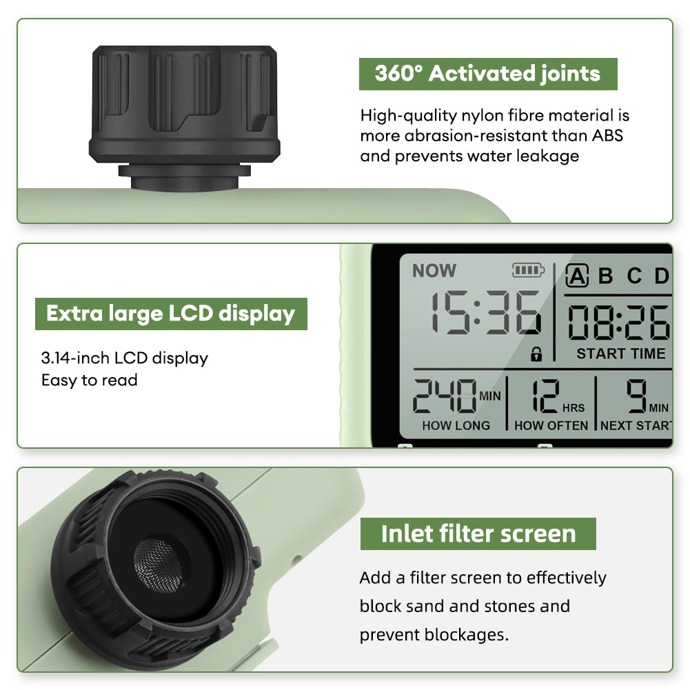 Set watering times from 1 second to 360 minutes and frequency from every hour to once every 15 days, giving full control over garden hydration. This feature solves overwatering and underwatering—two of the biggest frustrations for plant owners. Lawns and vegetables thrive with 20–30 minutes of watering every 2–3 days, ensuring deeper root growth.