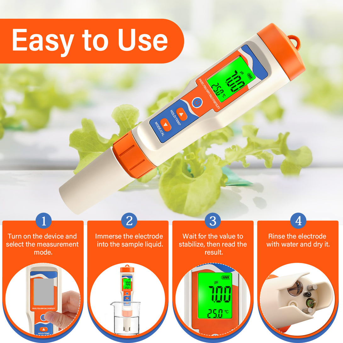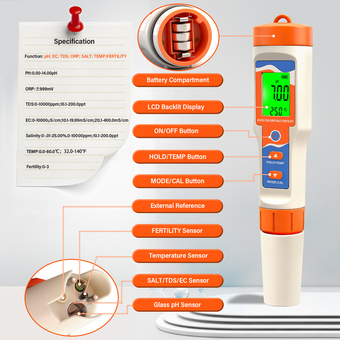 Comprehensive Testing: Measure pH (0–14), TDS (0–10000ppm), EC (0–10000 µS/cm), ORP, salt, temperature (0–60°C), and fertility in one device.