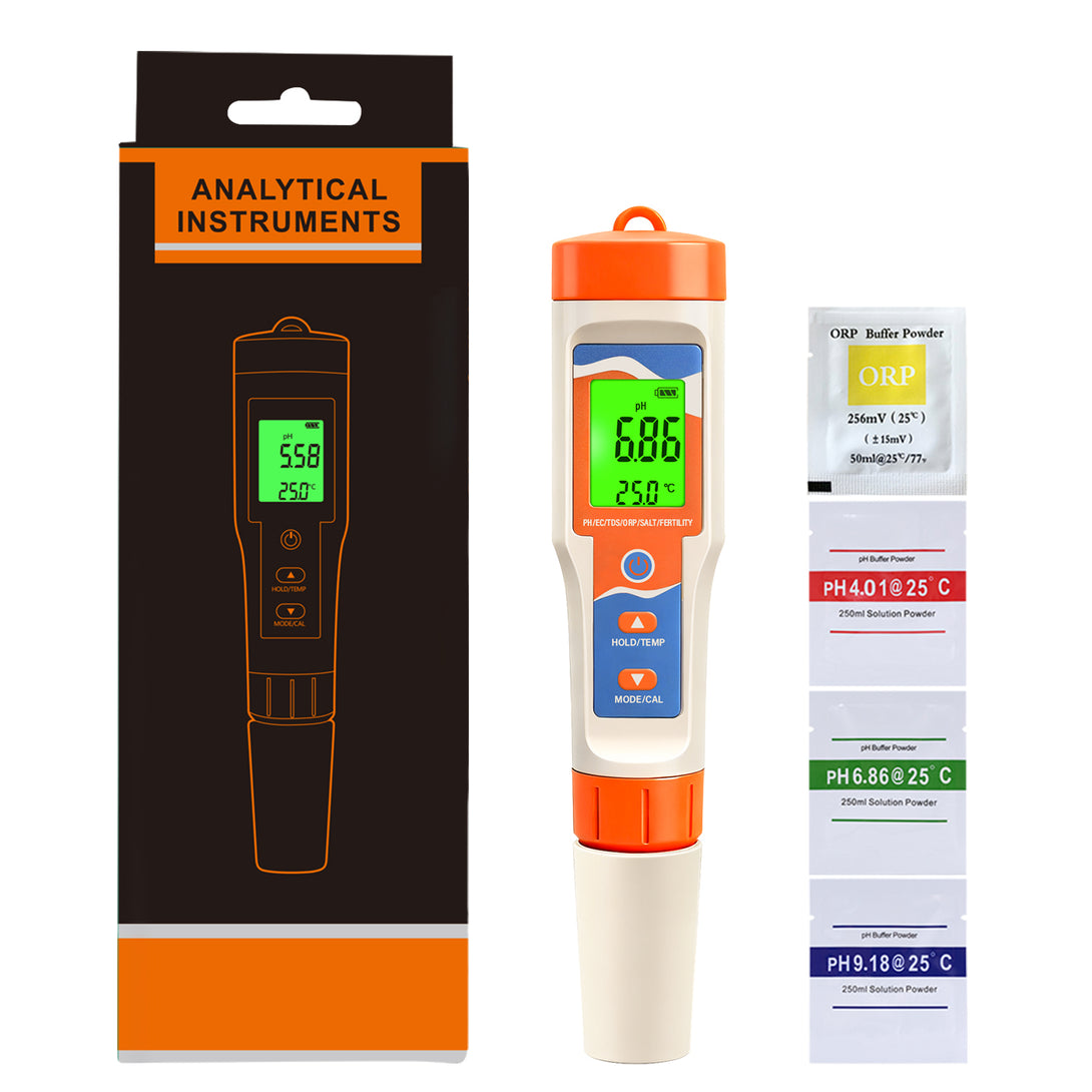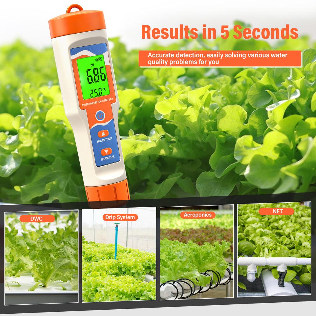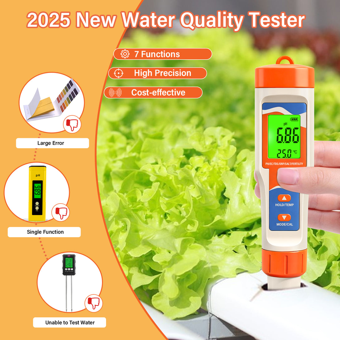 This advanced 7-in-1 Water Quality Meter is perfect for hydroponic growers, gardeners, and aquarium owners who need precise readings to maintain healthy plants and environments. With the ability to test pH, TDS, EC, ORP, salt, temperature, and fertility, it provides everything you need to ensure your water conditions are just right.